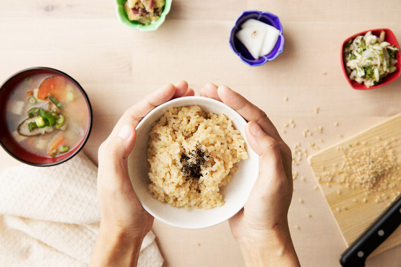 基本となる玄米・味噌汁(汁物)・漬物を伝統和食の3点セットとし提供致します。 玄米食堂のランチメニューは、この3点セットと日替わりの主菜1品、副菜2品の定食、おにぎり、野菜だけで作ったカレー。そしておやつです。